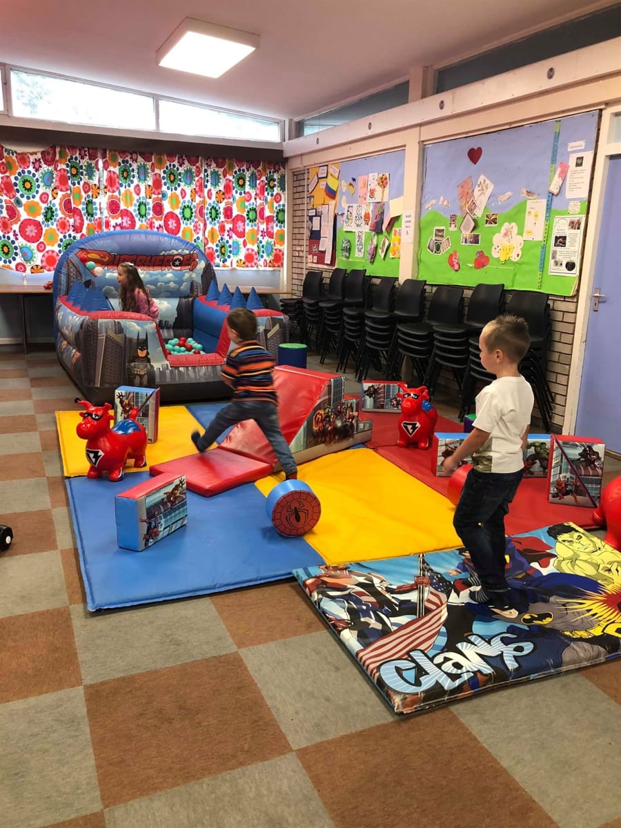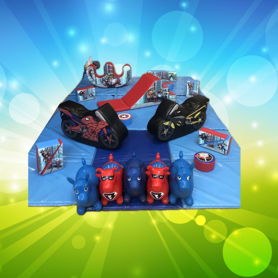 Superhero Softplay includes 10 build shapes, Step and slide, Soft play rocker, Spider-Man and Batman Superbikes and cute hero hoppers!