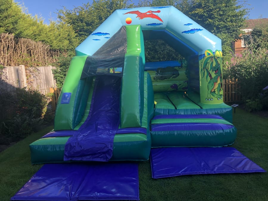 This is one of our new themes so we have decided to pull out all the stops ands dazzle you with something different to all other hirers in the West Midlands, Not only does this dinosaur castle look amazing it has the added fun of a 4ft slide to the front that is easy for even the littlest of legs to climb up the slide and wiz down. This space saving combo fits in majority of gardens due to the short front slide giving you a straight view of the castle and the slide area.