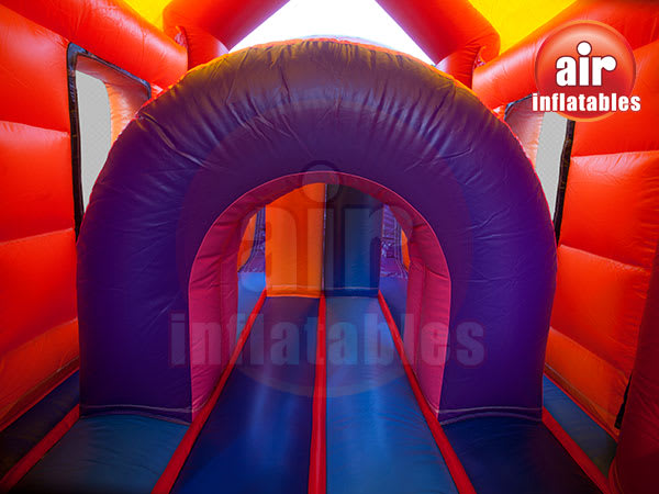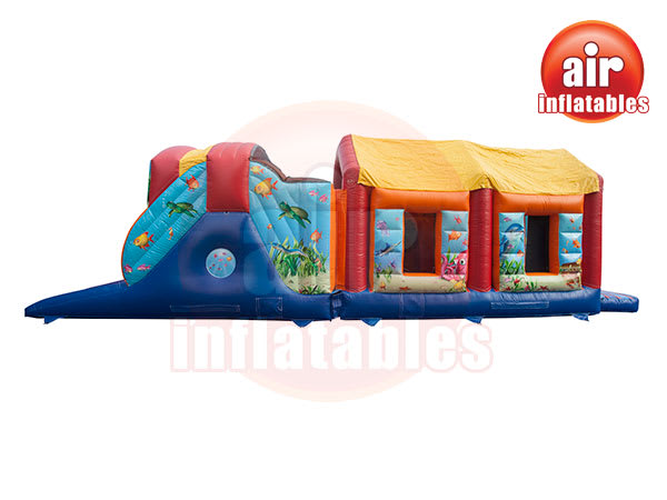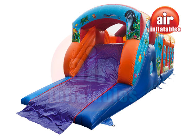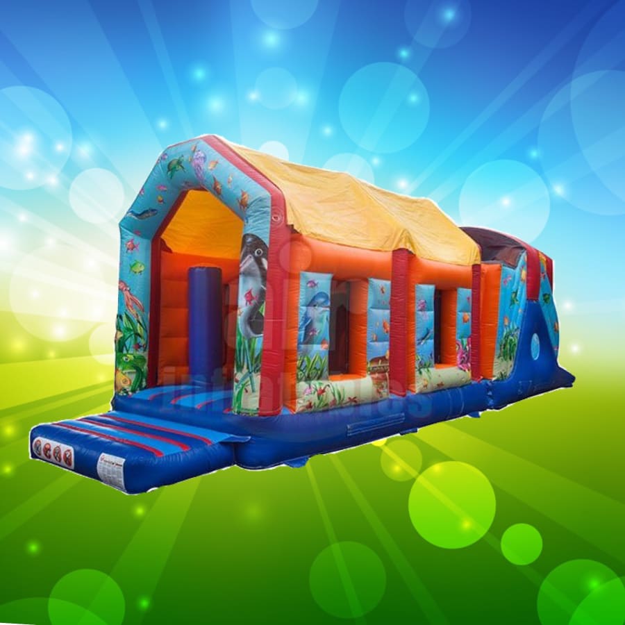 Best party fun guaranteed! This 35ft Obstacle Course will sure keep the children busy all day long! This brightly coloured under the sea themed obstacle course has the best of all worlds.. the biff an bash posts, the interior crawl tunnels and the climb and slide,